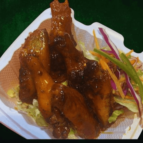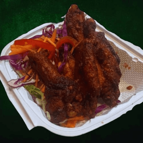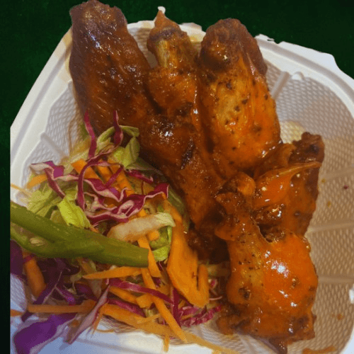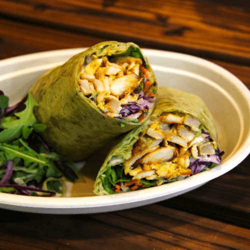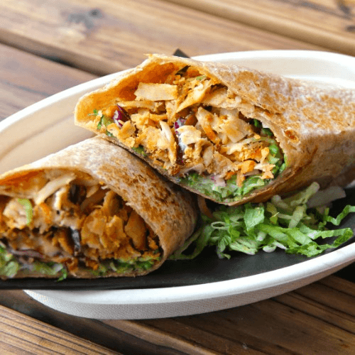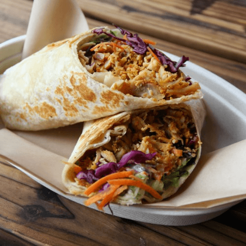 Colorful garden veggies, choice of meat and choice of sauce on the side.
