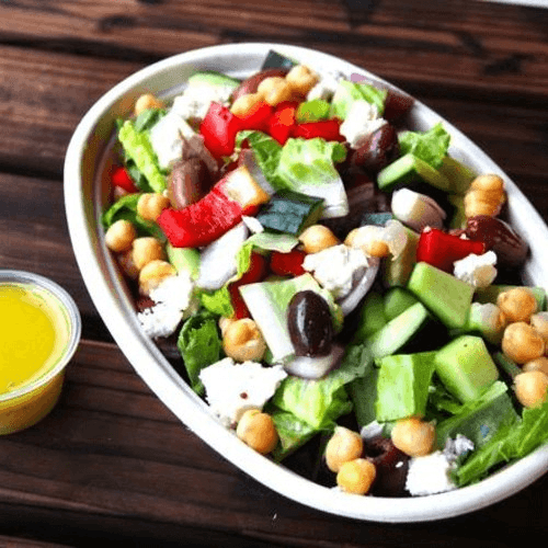 Romaine, veggies, chickpeas, olives, feta cheese and Mediterranean dressing.