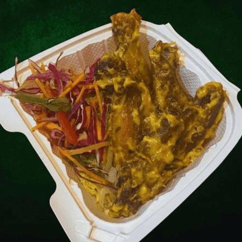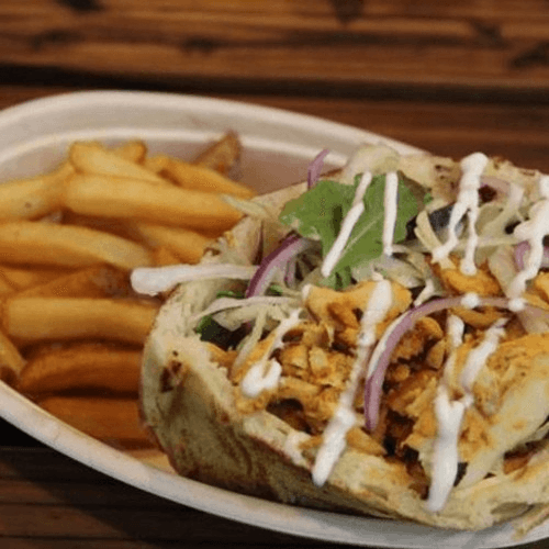 Fluffy bread, Shawarma Chicken, Lettuce, Side of French fries and special sauce on the top.
