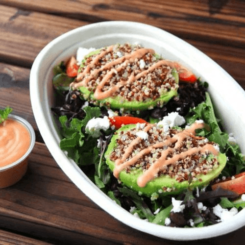 Tri-color quinoa, spring mix, feta cheese, black beans and signature sauce dressing on top.