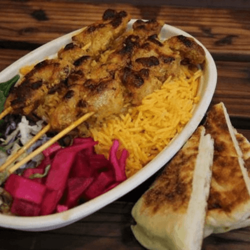 Flavored rice, Fluffy bread, Chicken souvlaki, tzatziki and pickled veggie.